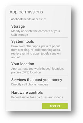 Don’t just keep pressing “OK” or “Accept” when installing an app. Pay attention to the permissions required (e.g. if the app has to access your phone book, camera, or internal storage), make sure you understand why the app has to access such information before accepting its requirements.