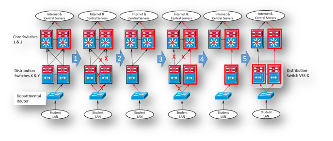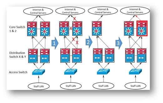 - Prepare to remove Distribution Switch Y. By adjusting L3 link cost and changing the priority of the Hot Standby Router Protocol (HSRP) per Virtual LAN (VLAN), e.g. Staff LAN, Student LAN, all L2/L3 network traffic is diverted to Distribution Switch X.