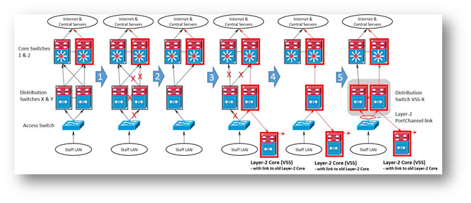 - Install new Distribution Switch Y in connection to new L2-core (VSS). Verify that it resumes fully and becomes operational again.
