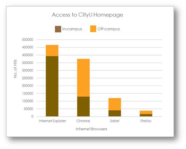 The bar chart below depicts the usage statistics collected from visits to the City University Homepage. Obviously, Internet Explorer (IE) is the most dominant browser and Chrome is also popular on campus. However, the picture is very different for off-campus usage as Chrome outperforms its competitors substantially. The reason behind these interesting results is the fact that IE is the default browser on campus LAN PCs.