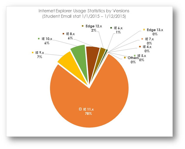 Based on student email statistics collected from 1/1/2015 - 1/12/2015, students used different versions of IE to manage their email. Although most students used IE 11.x, many use IE 8.x, 9.x and 10.x. Microsoft’s new browser, Edge, has not gained popularity yet.