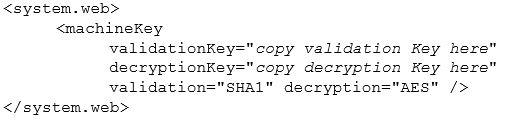 section defines a pair of keys, validationKey and decryptionKey, which is used for encrypting, decrypting and validating session data. This pair of keys can be generated by the IIS Manager of your development PC as follows: