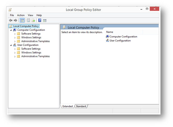 If a change on a policy setting is done locally, i.e. method i) mentioned above, the owner/administrator of the computer can use the local group policy editor. The diagram below shows a typical layout of the editor. However, it is advised that general users who are unfamiliar with the effect of the change should not modify the policy settings themselves since improper change of the settings may lead to chained and unpredictable effects.
