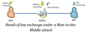 Man-in-the-Middle attack is a common threat during key exchange. For instance, Alice wants to send an encrypted message to Bob. Unfortunately, Mallory is monitoring the conversation. Alice will ask Bob his public key. Bob will sent his public key but Mallory will intercept it and send her public key instead of Bob’s one to Alice. Alice will encrypt her message with Mallory public key thinking it is Bob’s public key and send it to Bob. Mallory will intercept the message and decipher it thanks to her private key. Then she can modify it or just read it and send back to Bob the message encrypted with his public key. Bob will receive the message and think that it comes directly from Alice. He will be able to decipher it with his private key.