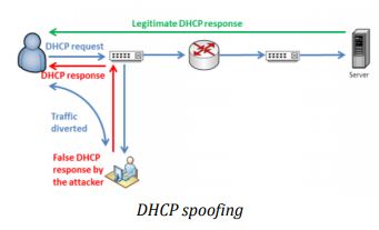 DHCP spoofing: the attacker replies before the DHCP server and diverts traffic. He can then manipulate the victim’s IP address, the gateway address assigned to the victim and the DNS address.