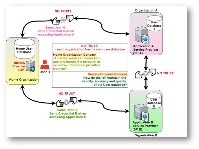 The following diagram shows there is a lack of TRUST between the home organisation, running the identity provider (idP) and other organisations, the service provider (SP) that provides the application.