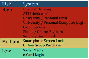 Risk System High Internet Banking ATM debit card University / Personal Email University / Personal Computer Login Cloud Service Phone / Online Payment Security Guard Lock Medium Smartphone Screen Lock Online Group Purchase Low Social Media e-Card Login