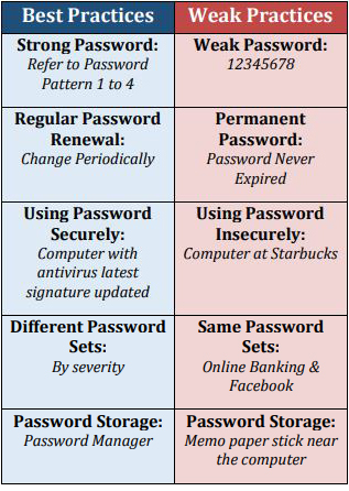 While the best practices for password management is evolving, the following table compares best versus weak practices of managing password: