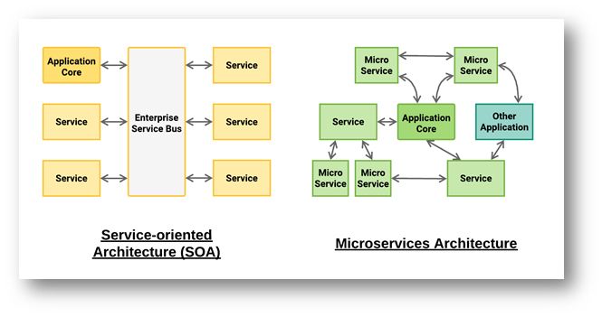 Furthermore, in the Microservices architecture, RESTful APIs are being used as a common language between services and systems. This eliminates the need for establishing and maintaining an extra layer of Enterprise Service Bus (ESB) that is required by the SOA.