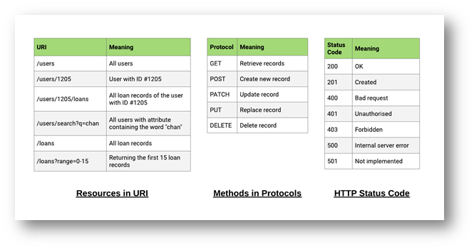 To achieve the decoupling style of the Microservices architecture, RESTful APIs are normally being used, which includes a resource as well as a corresponding resource representation, and it follows the 6 guiding principles of REST [3]. If HTTP is being used for the API implementation, that will be the URI and HTTP protocol respectively, and the HTTP status code could further indicate if the API execution is a success or not.