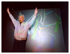 strokes and patches that float in 3-D space in synchronization with the artist's movement. Body gestures affect the size of the brushstrokes while body acceleration and speed control colour saturation and value respectively.