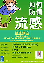 為加強校內人士對流感的認識,大學保健中心將於11月14日(星期一)下午一時至二時,於蔣麗莉演講廳(七號演講廳)舉行「如何防備流感」講座,講者為政府衛生署衛生防護中心的醫護人員。講座以粵語進行,歡迎參加。如欲查詢詳情,請致電2788 8022與楊仲儀保健中心聯絡。