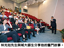 論壇由校長張信剛教授致歡迎辭揭開序幕。由只有一台舊式二手印刷機的小廠房,發展成為今天業務遍全球的星光集團,林先生白手興家的故事和企業經營的精神,讓在座近百名商學院學生上了寶貴一課。