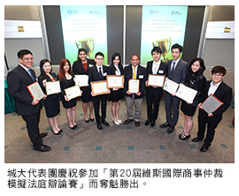 城大代表隊參加3月底在奧地利維也納舉行的「第20屆維斯國際商事仲裁模擬法庭辯論賽」,擊敗來自67個國家近300支參賽隊伍,包括國際上法律教育名列前茅的哈佛、耶魯等大學的辯論隊,奪得冠軍寶座。