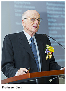 Bach教授以「自身免疫疾病與過敏症的成因何在?」為題,在演講中探討自身免疫疾病與過敏疾病的成因。他說,工業化國家的傳染病逐漸減少,同時第一型糖尿病與多發性硬化症等免疫功能紊亂疾病卻逐漸增加,目前已有相當有力的證據表明兩者有因果關係。Bach 教授現為法國自然科學院常任秘書,亦是法國國家醫學科學院院士、英國醫學科學院院士。
