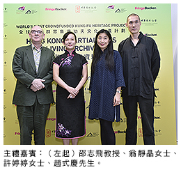 交接支票儀式4月29日在城大舉行,多位功夫大師現場演示立體動作擷取技術的運用。主持儀式的嘉賓包括:中華國術總會創辦人趙式慶先生、城大創意媒體學院院長邵志飛教授、FringeBacker執行董事許婷婷女士、劉家良導演慈善基金創辦人翁靜晶女士