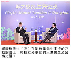 在晚宴的互動論壇中,「上海新天地」創立人、瑞安集團主席羅康瑞先生以「探索上海——現在與未來」為題與校友互動交流,分享他在上海營商的寶貴經驗。城大校友、評議會主席兼校董會成員劉冠業先生擔任互動論壇的主持。