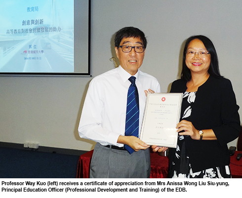 The title of the talk was “Creativity and Innovation: Professor Kuo Talks about the Impact of Higher Education on Sustainable Society Development”. In attendance were around 100 EDB administrative staff, school principals from primary and secondary schools in Hong Kong, including some CityU alumni.