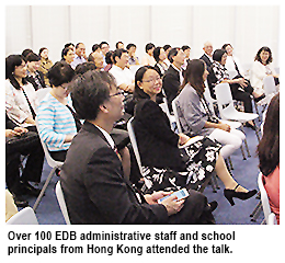 The EDB regularly organises activities featuring society leaders from various circles to deliver talks to EDB staff in an effort to enhance quality. Guests invited include people of the calibre of Mr Shih Wing-ching from the property sector and Mr Jasper Tsang Yok-sing, Former President of the Legislative Council, from the political arena.