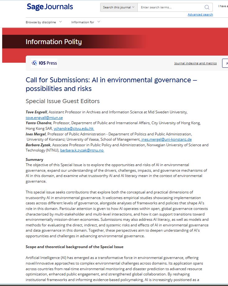We are seeking rigorous empirical and conceptual studies on deploying AI for environmental governance while managing its risks. The intersection of AI and environment is where the future of governance is being written.