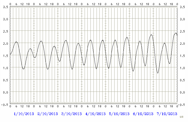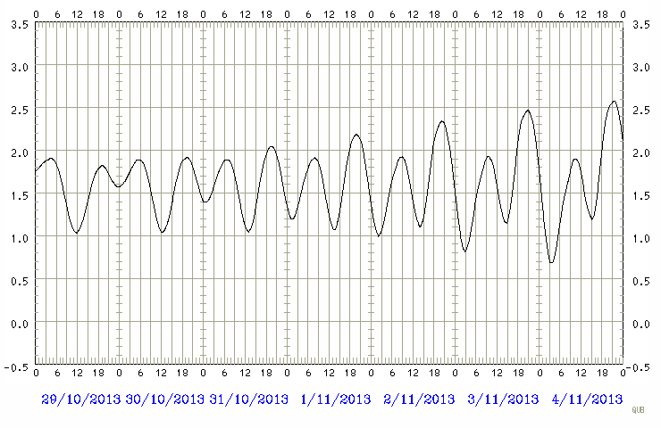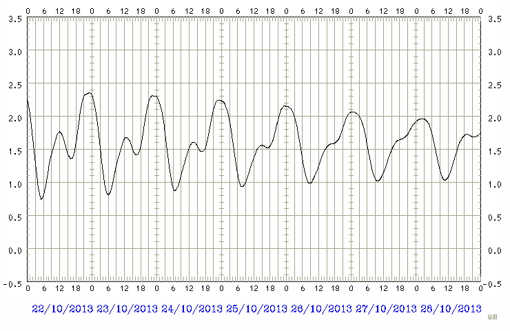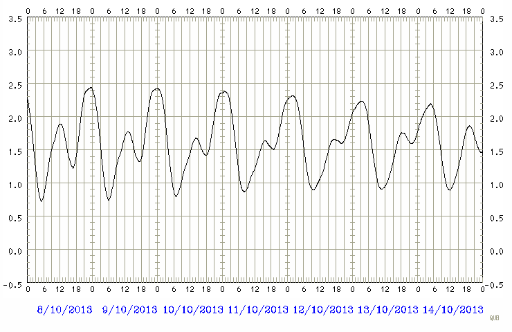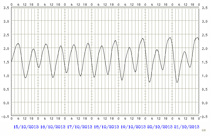 semi-diurnal (and mixed) with, for most days of the month, 2 high tides and 2 low tides. The tidal range is 1.4m.