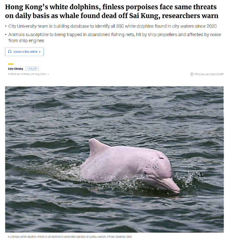 Media & Press Aug 26 2023 SCMP: Hong Kong’s white dolphins, finless porpoises face same threats on daily basis as whale found dead off Sai Kung, researchers warn Aug 25 2023 香港新聞網: 專訪海洋專家梁美儀:核污水或1年後流入香港附近海域 Aug 13 2023 明報: 國際未管制新興污染物威脅鯨豚濃度隨食物鏈倍增最終可傳人專家促 Aug 02 2023 信報財經新聞: 鯨魚枉死謝展寰拒認政府反應慢城大專家指傷口深及骨骼致生存機會大減 Aug 02 2023 文匯報: 專家揭鯨魚或受船螺旋槳撞擊致死兩傷口深見骨或感染 Aug 02 2023 大公報: 話你知/「北冥有魚,其名為鯤」 Aug 02 2023 明報: 海園: 鯨背新傷硬物造成料遭船撞 解剖團隊指兩傷口深及骨骼存活率大減 Aug 01 2023 AM730: 西貢鯨魚死亡|初步分析兩傷口深及骨骼或受感染致生存機會大減 Aug 01 2023 HK01: 西貢鯨魚|城大教授報告解剖發現:兩傷口深及骨骼大減存活機率 « 1 2 3 4 5 6 7 8 9 10 11 12 13 14 15 16 17 »