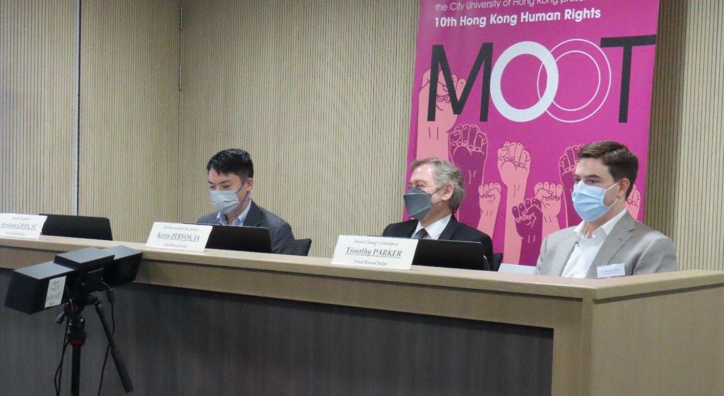 Due to COVID-19 social distancing rules, on 27 March 2021, the Final Round took place at the CityU Moot Court without live audiences and was live-streamed in front of an online audience registering of over 100. The moot was adjudicated by a distinguished panel of judges: Mr Justice Kevin ZERVOS, JA (Justice of Appeal of the Court of Appeal of the High Court); Mr Abraham CHAN, SC (Temple Chambers); and Mr Timothy PARKER (Denis Chang’s Chambers).