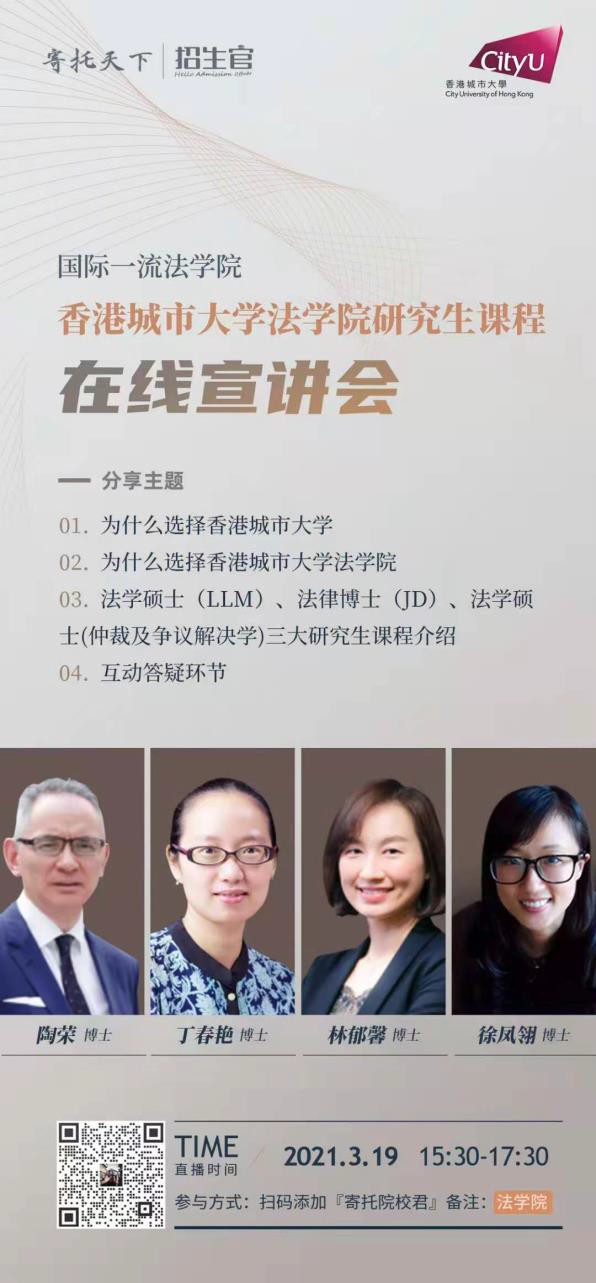為了使有志報讀香港城市大學(城大)法律學院的同學詳細瞭解學院的教學特色以及 2021 年的研究生招生要求,我院於 3 月 19 日及 4 月 28 日在寄託天下(GTER)通過線上 直播方式,分別舉行了兩場研究生課程招生宣講會。法律學院副院長丁春艷博士、法學碩士課程主任林郁馨博士、法學碩士(仲裁及爭議解決學)課程主任陶榮博士、法律博士課程副主任徐鳳翎博士出席此次宣講會。兩次會議共吸引了近 1,400 人參與。