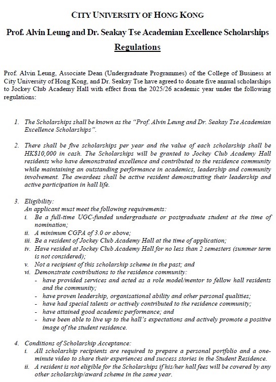Prof. Alvin Leung and Dr. Seakay Tse Academian Excellence Scholarships (Hall 4)