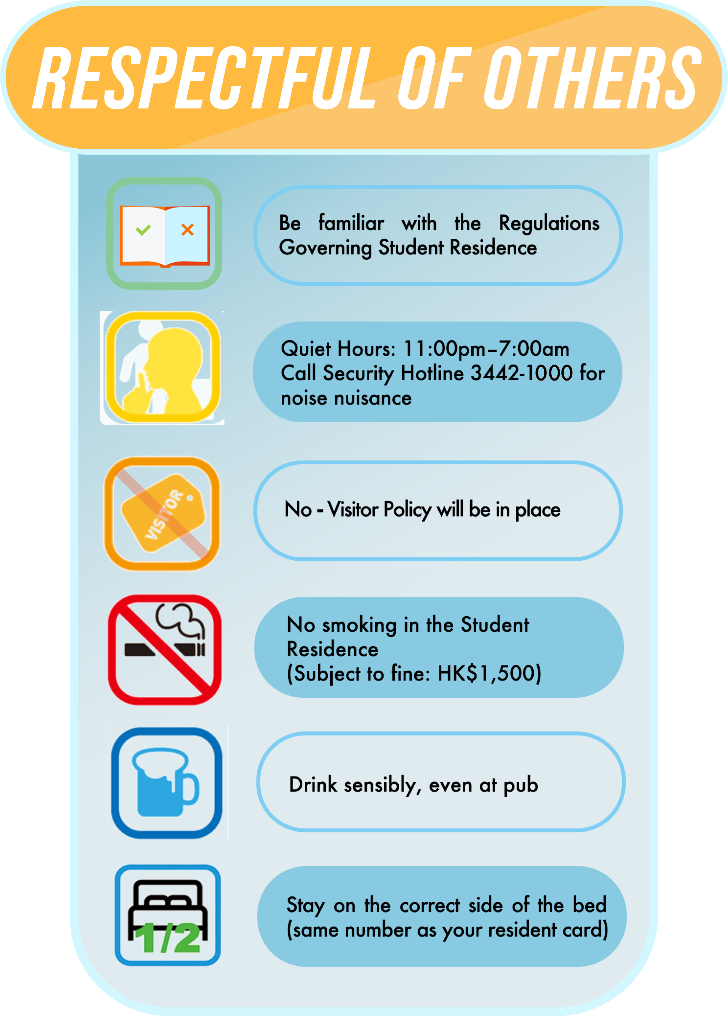 Be mindful when visiting residents in opposite gender |