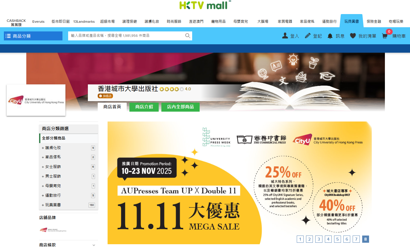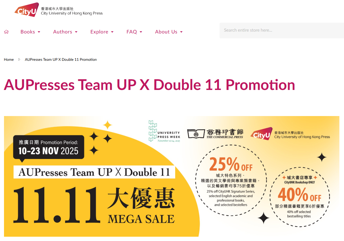 The City University of Hong Kong (CityUHK) Press is thrilled to announce an exclusive book promotion for the Double 11 shopping festival and the annual University Press Week under the global #TeamUP theme initiated by the Association of University Presses (AUPresses). This two-week campaign, running from 10 to 23 November 2025, will be available via three platforms: the CityUHK Bookshop, HKTVMall, and the CityUHK Press website.