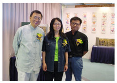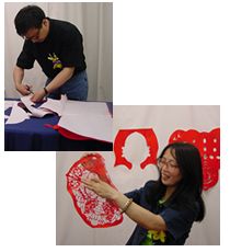 氏伉儷更示範了團花和以青蛙為造型的剪紙作品。于平、任憑從事剪紙創作多年,作品曾獲<中國剪紙大獎賽>一等獎,他們出生於山東省,深受當地的豐富民間藝術氛圍所陶冶,八年前于氏夫婦接觸到山東民間彩印花布,發現拼色剪紙和民間彩印有許多相通之處,於是把剪紙與民間彩印結合,全心轉向漏印版畫創作,以獨特風格表現中國的傳統民風。
