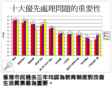 2005年十大優先處理問題的重要性依次為:教育制度、健康與衛生、環境保護、健全的經濟、關心員工的良心僱主、城市規劃、人口政策、社區精神與市民福祉、與內地融合、公民自由與人權。