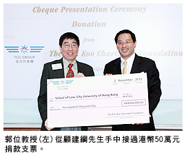 香港城市大學(城大)法律學院於11月2日獲顧國華慈善基金捐贈港幣50萬元,用以支持法律學院新開設的海事交通法課程。