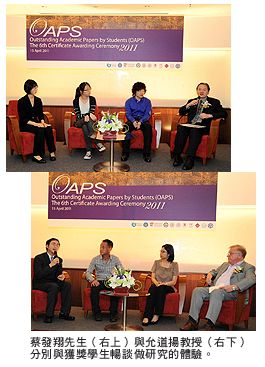 在對話交流時段,南洋理工大學圖書館館長蔡發翔先生及城大教育發展及通識教育處處長允道揚教授分別與獲獎的學生暢談做研究的體驗。