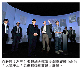 在發表演講前,白教授參觀了邵逸夫創意媒體中心,並觀看由創意媒體學院院長邵志飛教授創設的「人間淨土:走進敦煌莫高窟」展覽,深表讚賞。
