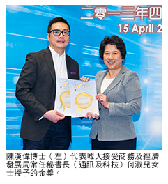 此外,城大亦憑「無紙辦公室」研究成果獲得「2013年電腦世界榮譽獎」可持續發展組別的獎項,頒獎禮將於今年六月在美國首都華盛頓舉行。城大資訊科技團隊善用新科技為全球的持續發展而出力,陳博士非常感謝他們的努力與熱誠。該成果使城大人力資源處及財務處得以把一百萬頁以上的文件化為電子文檔,大幅減少耗紙。