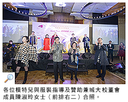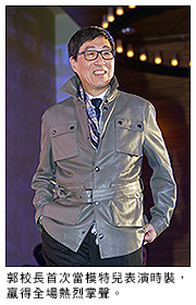 晚宴開始後不久,會場燈光漸漸轉暗,現場樂隊和兩名是城大學生的小提琴手奏起樂曲,大門隨即緩緩打開。首先進場的是郭校長,他身穿灰色皮褸,在席間及台上走「貓步」進行時裝表演,引起全場一片歡呼聲和掌聲。隨後,秘書長林群聲教授、協理副校長(發展及校友聯絡)陳燕玲女士、副校長(行政)李惠光先生、副校長(學生事務)葉豪盛教授、協理學務副校長(品質保證)Christian Wagner教授、協理副校長(中國內地發展)郝剛博士,以及副校長(發展及對外關係)李國安教授陸續進場。他們身穿時尚服飾,在舞台上儀態萬千地展示新裝。平日一臉嚴肅的教授們,當模特兒竟也勝任有餘,令台下觀眾喜出望外,紛紛報以熱烈掌聲。
