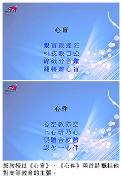郭教授以自撰的兩首詩《心盲》、《心件》,概括他對高等教育的主張——教學和研究並重,而且要政治歸政治、教育歸教育。