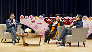 校友陸浩明先生在「名人真情對話」環節中與張堅庭導演和名人Ms Maria Cordero (暱稱「肥媽」)互動交流。