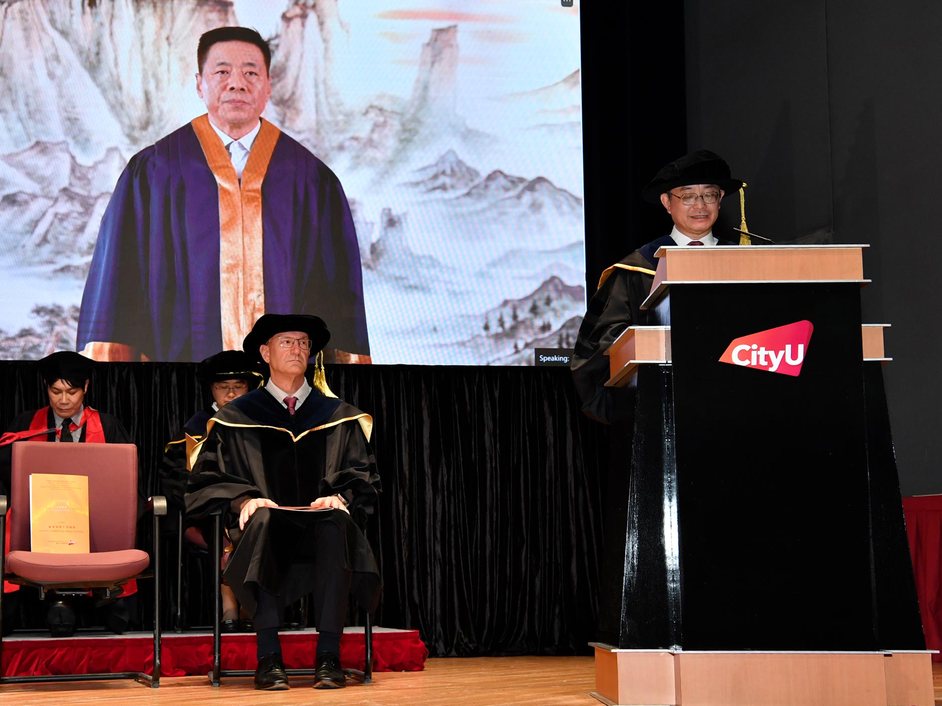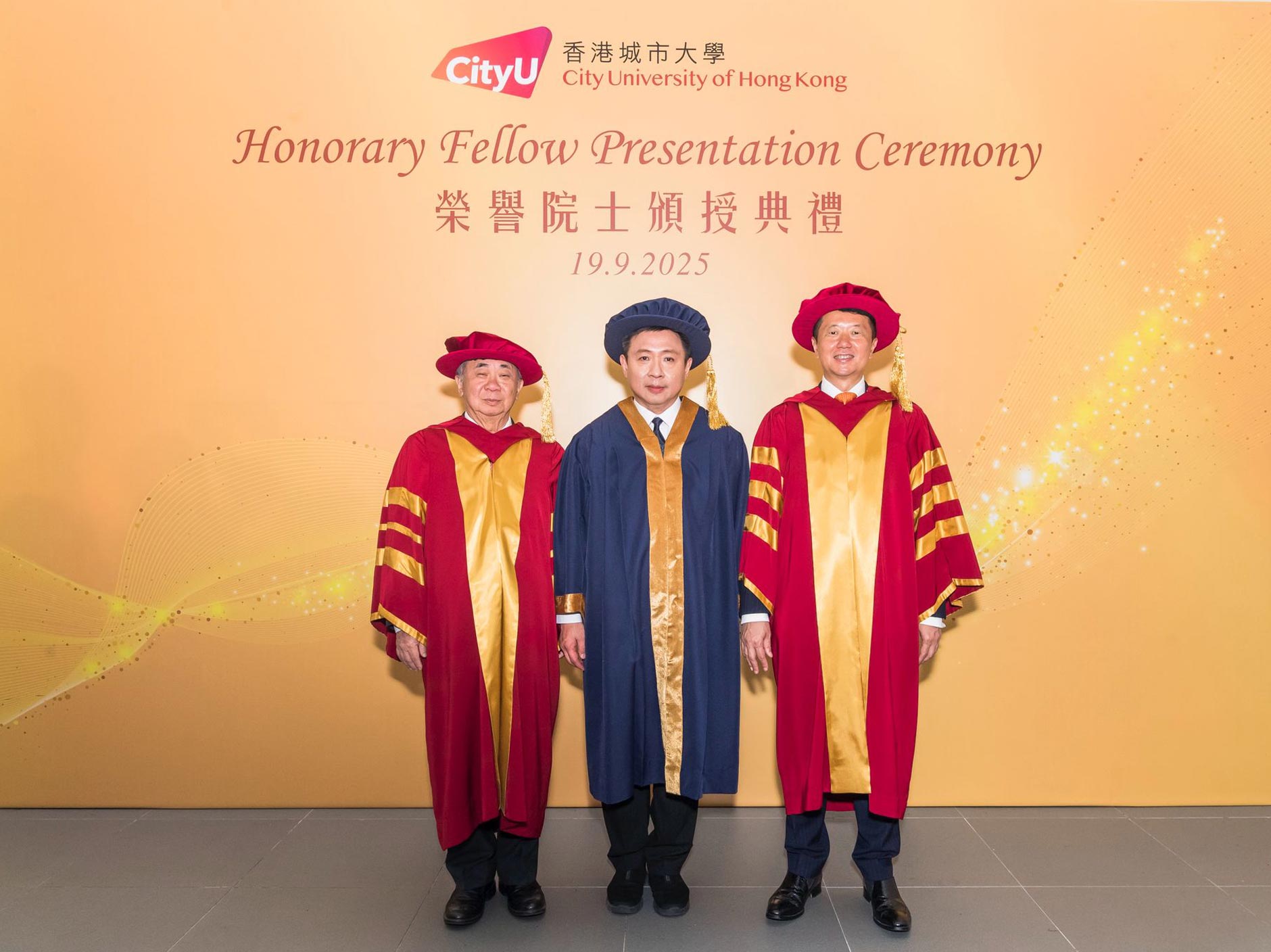 魏先生在致辭時感謝兩位榮譽院士長期以來為大學發展提出的寶貴見解及貢獻。他們憑藉卓越領導力、正直品格和奉獻精神,為社會貢獻良多,是城大社群以及社會的典範。他指,陳醫生是一位傑出的牙科醫生和敬業的社區領袖,數十年來一直引領著香港醫療保健事業的發展;而今日在山東以視像形式出席的張先生,則是一位富遠見的企業家及熱心的慈善家,除了在商界獲得非凡成就外,更持續慷慨支持大學的策略性舉措,深信回饋社會亦是企業發展重要一環。