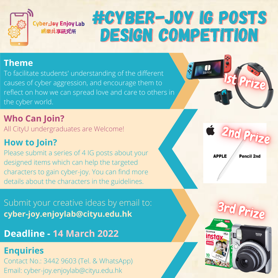 To facilitate students' understanding of the different causes of cyber aggression, and encourage them to reflect on how we can spread love and care to others in the cyber world, CityU undergraduate students are invited to join our #Cyber-Joy IG Posts Design Competition!