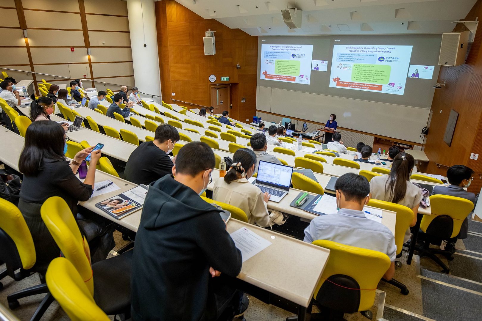香港城大協理副校長(中國大陸事務)暨HK Tech 300 培育小組委員會主席羅璇博士向獲選隊伍介紹HK Tech 300種子基金的使用指引及詳情。迎新日上更邀請了嘉賓介紹開設公司銀行戶口及財務管理等注意事項。校方代表亦為隊伍講述由HK Tech 300多個合作夥伴舉辦的相關活動資訊。最後各隊伍分批前往參觀專為HK Tech 300計劃而新設立的共享工作間 。
