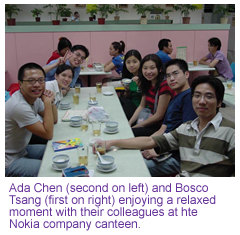 "My biggest gain," said Andrew Cheung, another EE student who teamed up with Ada on the wireless LAN project at Nokia, "is a new perspective on our compatriots in China, who are so conscientious, hard-working and focused in their work." The local staff they met at Nokia--particularly those from the mainland--worked long hours, seldom complained and, most important of all, were generally more open-minded and more creative in their problem solving skills, according to Ada and Andrew.
