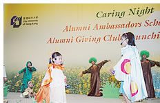 Caring Night, organized by the Development and Alumni Relations Office (DAO), included musical performances by the Alumni Band, and alumni and Cantonese pop singer Mr Edwin Siu. The evening's entertainment also featured a one-act play, "City Garden", performed by children of alumni. Mr Ricky Chu, 2001 MA International Business Management graduate whose five-year old daughter acted in the play commented, "This is the first time for me to take part in an alumni activity. It is so successful and encouraging. I think we should try our best to support our alma mater, be it in monetary or other terms." [more photos]