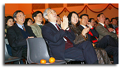 在校長致新春賀詞後,由楊珍小姐、張大可先生、奧磐石博士和允道揚教授扮演的財神爺與大學高層一起向同事拜年,並向在場的教職