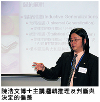 他續說:「在我的課堂裏,我會與老師分享教學心得以及人文、科學、工程與社會方面的現實生活例子,以便老師作示範,向學生講解批判及創意思考的技巧和方法。」陳博士今年以「邏輯推理」及「判斷與決定的偏見」的講課,結合「語文誤用與謬誤」及「創意思考」的講課,協助中學老師培養學生的語文能力及高層次思考。