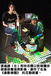 r上揀選一個影像,當參與者身體部位進入投射區的影像範圍並移動身體時,影像上的小方塊亦會隨之翻動,並轉化成音符。張瀚謙和林志輝運用媒體技術把影像轉化成互動媒體,是作品的最大特色。「傳統的音樂,以西方為例,是以五線譜創作,規限性較大,但這個互動裝置卻打破了傳統音樂創作的方法,變化多端。這亦是創意媒體學院提倡的『打破規限』意念,」張瀚謙說。他與林志輝的組合可謂集音樂藝術和媒體技術的元素,因為張瀚謙熱愛玩音樂,而林志輝則擅長利用不同媒體技術進行藝術創作。