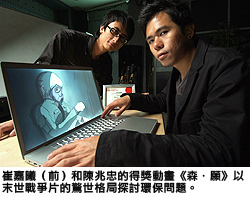崔嘉曦與陳兆忠的得獎動畫《森.願》,以末世戰爭片的驚世格局探討環保問題。故事講述未來世界的女孩參與遊行,抗議大財團大興土木破壞環境,被捉拿入獄,她為逃獄而服食老樹給她的藥物變成了樹,可惜最終仍難逃一死。崔嘉曦表示故事是嘲諷大財團對環境的破壞力,並以片名《森.願》的諧音,表達對追求環保的心願。