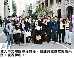 城大辯論隊得勝獲獎,隊員都感到非常興奮。比賽舉行期間,正值學期末,隊員要應付考試、提交論文或報告,十分繁忙,辯論賽的預備演練倍感吃力。擔任結辯的辯論隊隊長方祺輝說:「這次參賽,讓我們深深體會到善用時間的重要。在繁重的學業壓力下擠出時間準備比賽,實在是一場大考驗。」